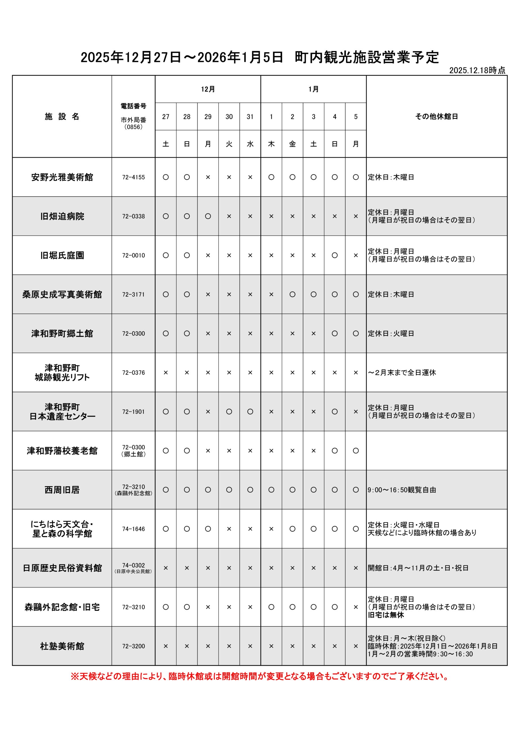 観光協会の表で 12/26〜1/3全日開館。 |